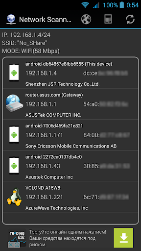 Overview: The program displays the IP and MAC addresses, the names of the hosts on the your local network. Also there is a built-in port scanner (tcp) and small auxiliary tools.